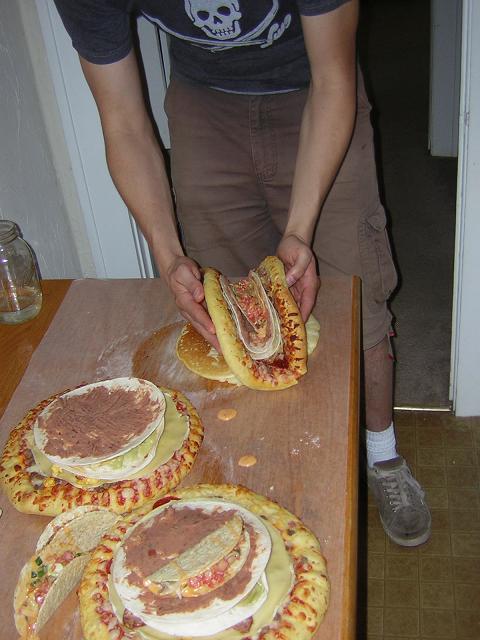 A guy on Myspace recreate an old Saturday Night Live skit, making a crunchy beef taco with nacho cheese, lettuce, tomato and southwestern sauce wrapped in a soft flour tortilla with a layer of refried beans in between, then wrapped in a corn tortilla with a layer of Monterey Jack cheese in a deep fried gordita shell with guacamole sauce baked in a corn husk topped with pico de gallo, wrapped in a crepe, filled with egg, griere cheese, sausage and portobello mushrooms, all wrapped in a chicago-style deep dish pizza wrapped in a blueberry pancake and finally deep fried with spicy vegetarian chili dipping sauce.