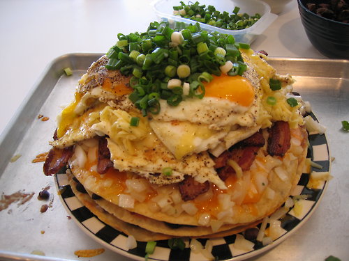 Three stacks of bacon, sausage, elk meat, onions and cheese between tortillas all topped with sour cream, two fried eggs and scallions.