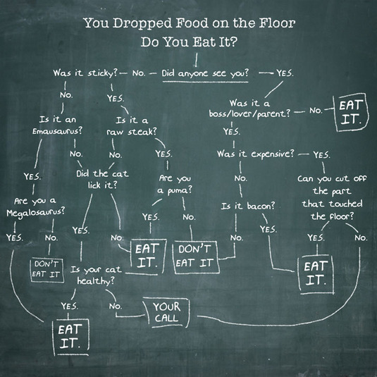 Friends, worry no more! No longer do we suffer through that pain and awkwardness. Thanks to recent research and the stylings of SFWeekly, we now have guidance. I give you, the food-on-floor decision tree: